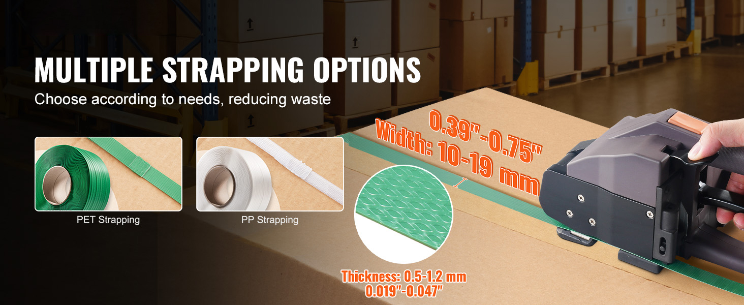 Versatile Strapping Options: Our electric strapping machine works great with polypropylene (PP) and polyester (PET) strapping bands. It handles widths from 0.39" to 0.75" and thicknesses from 0.02" to 0.05". This means you can easily pack items of different sizes and weights, saving you cost by choosing the right strap for the job.