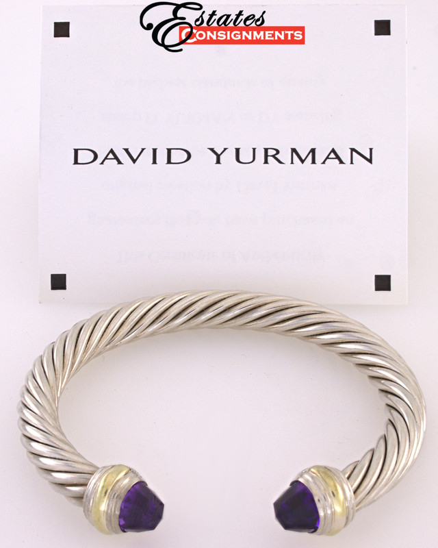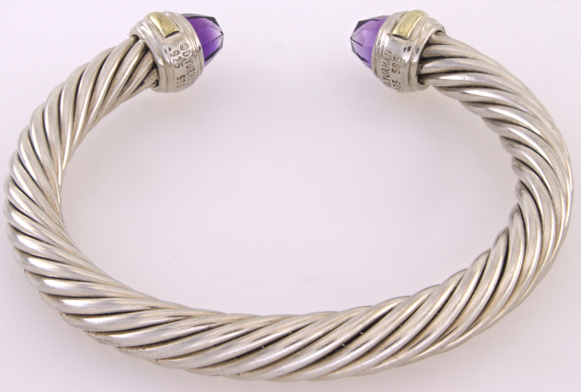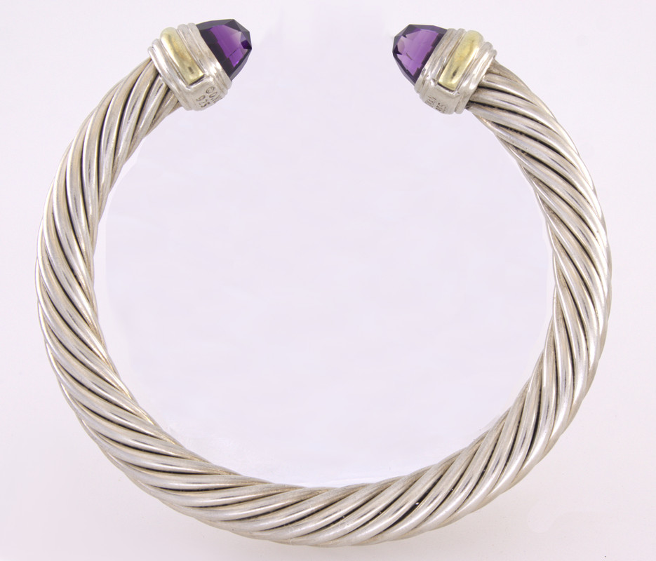Featuring amethyst 7mm cable cuff bracelet in a sterling silver and 14k gold, wrist size 6 1/4 inches, gap 7/8 inches approximately , marked © D. Yurman, 925-585, Gross weight 40.52 grams.