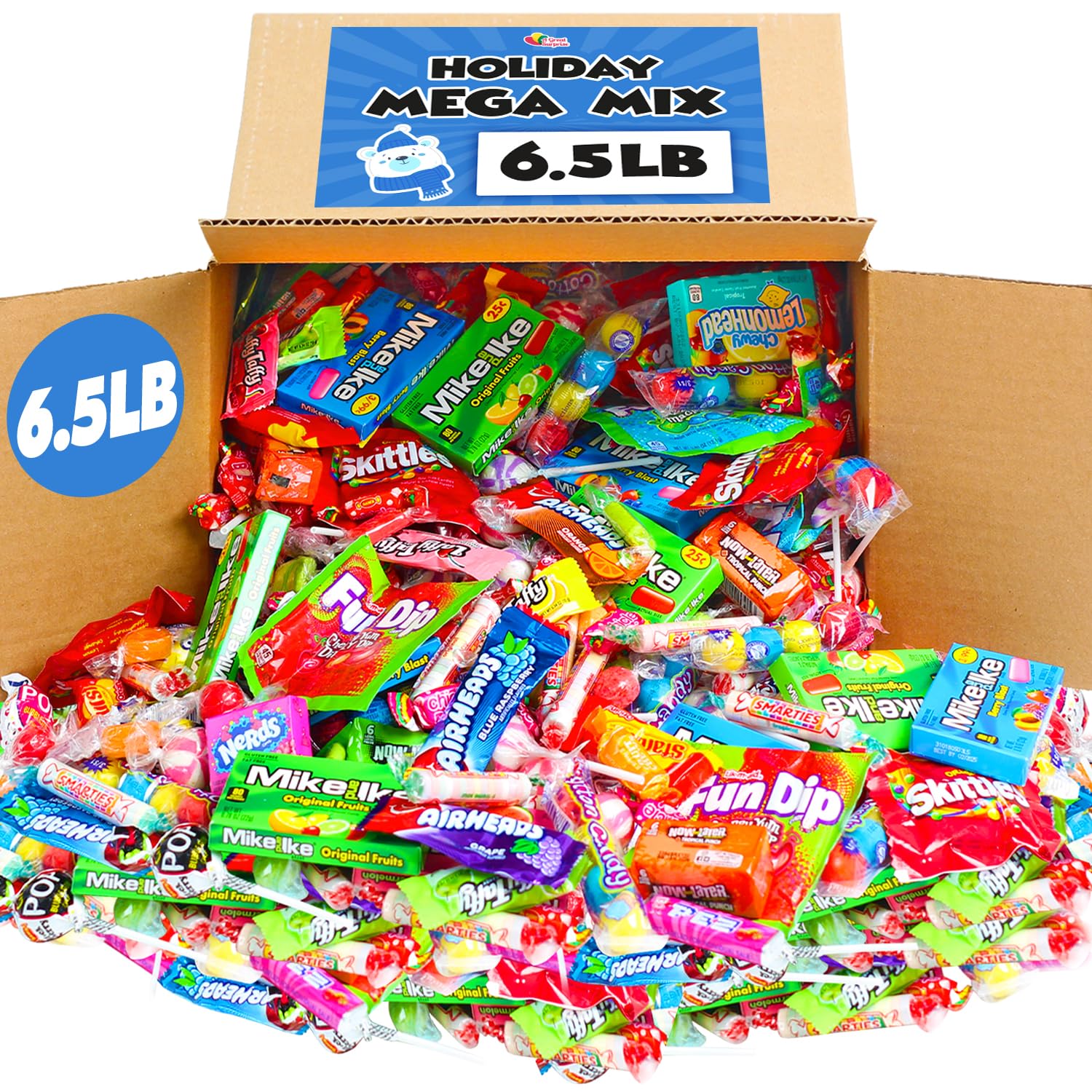 OVER 350 Pieces of Individually Wrapped Candy. Image not taken to scale. Contains approximately 6.5 lbs of candy. Perfect assortment for all holidays and parties. Great candy that will be loved by kids of all ages (and adults too). Enjoy these sweet treats with many enticing flavors of the classic candy you crave. May include tropical smarties, extreme sour smarties, smarties, chick-o-stick, chupa chups, fruna slabs, dubble bubble cotton candy gumballs, gummi hotdogs, frunas, gummi hamburgers, now and later mini bars, lemonheads, jawbusters, fire balls, airheads mini bars, tootsie rolls, tootsie roll fruit chews, dubble bubble, classic lollipops, mini nerd boxes. Item is a variety and may not include all listed candy. Individually wrapped. Items are repackaged in a facility that may contain milk, soy, peanuts, tree nuts, eggs, wheat and all other allergens.
