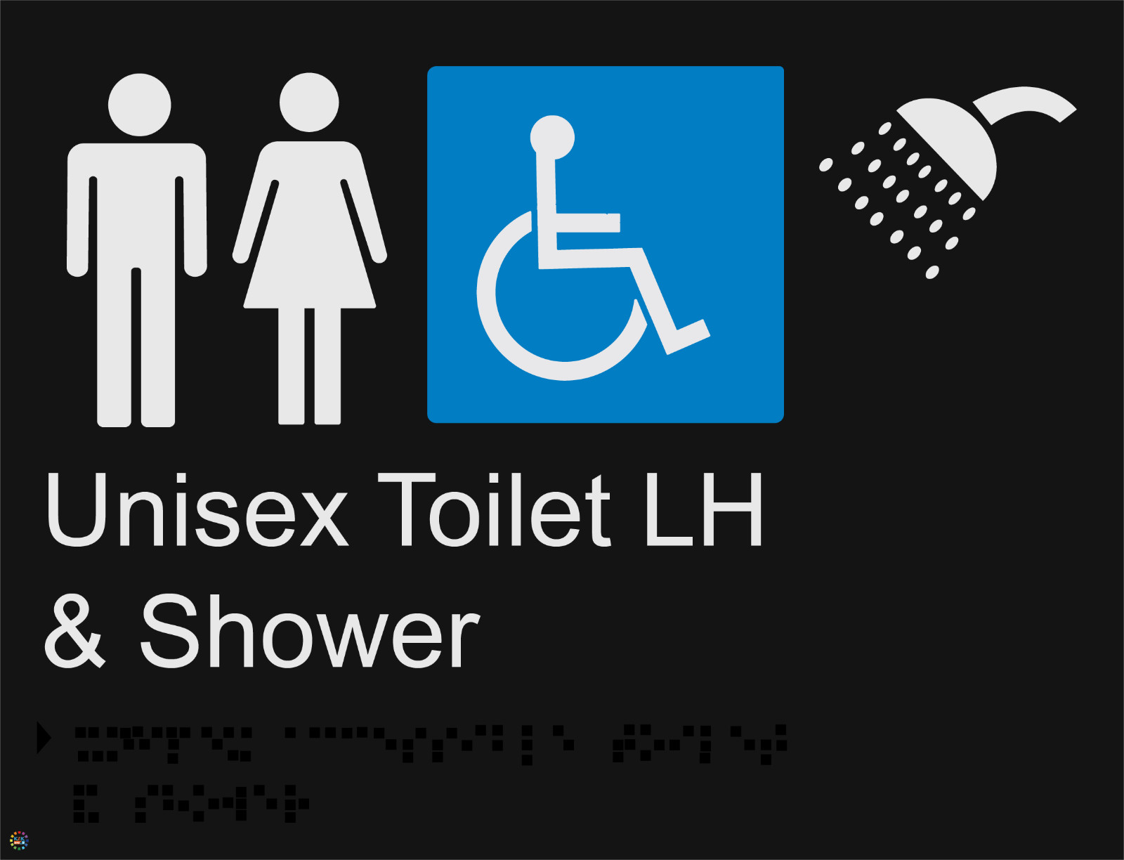 Enhance accessibility and provide clear directional guidance with the Unisex Disabled Shower LH Braille and Tactile Sign (BR85), designed to guide individuals toward left-hand unisex disabled shower facilities in public buildings, workplaces, and community environments. This sign features raised tactile text, Grade 1 Braille, and a clear, unisex disabled shower symbol oriented for left-hand entrances, assisting people with low vision to confidently locate the correct amenities. Ideal for offices, schools, hospitals, gyms, transport hubs, and hospitality venues, it promotes safe movement while supporting consistent accessibility communication throughout your premises. Manufactured from durable 3mm thick PVC, the sign is available in a silver background with black text or a black background with white text, providing strong contrast and long-lasting readability in indoor or sheltered outdoor areas. Weather-resistant, impact-resistant, and supplied with secure double-sided tape, it allows fast and reliable installation on smooth, clean surfaces. Fully compliant with BCA/NCC Part D4D7, Specification 15, and AS1428.1-2009, the sign ensures dependable guidance and clear identification of left-hand unisex disabled shower facilities for all users.