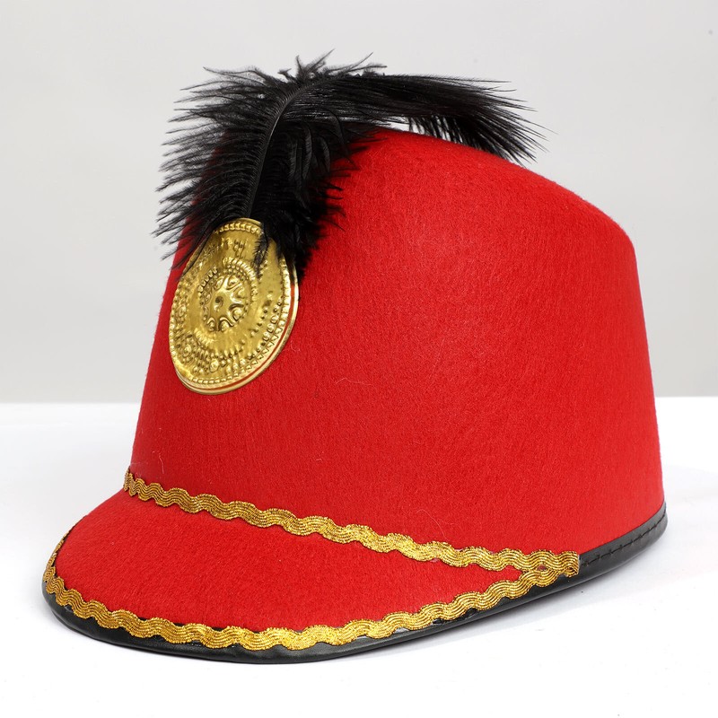 The hat is decorated with a plastic badge and gold braid, and topped with a bright color feather. Very eye-catching and fashionable, making the wearer the focus of the crowd.