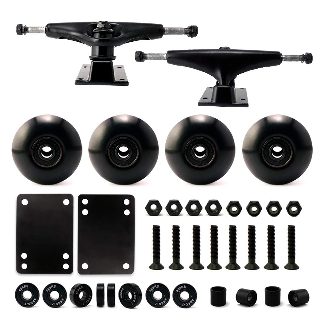 SKATEBOARD PARTS SET: It includes skateboard trucks 5.25 (139mm), skateboard wheels 52mm, skateboard bearings Abec 7, skateboard screws 1.25", skateboard riser pads 2mm, skateboard spacer