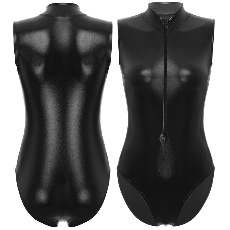 Women’s sleeveless gymnastics leotard, cutout back and mock neck with press buttons for easy wearing.