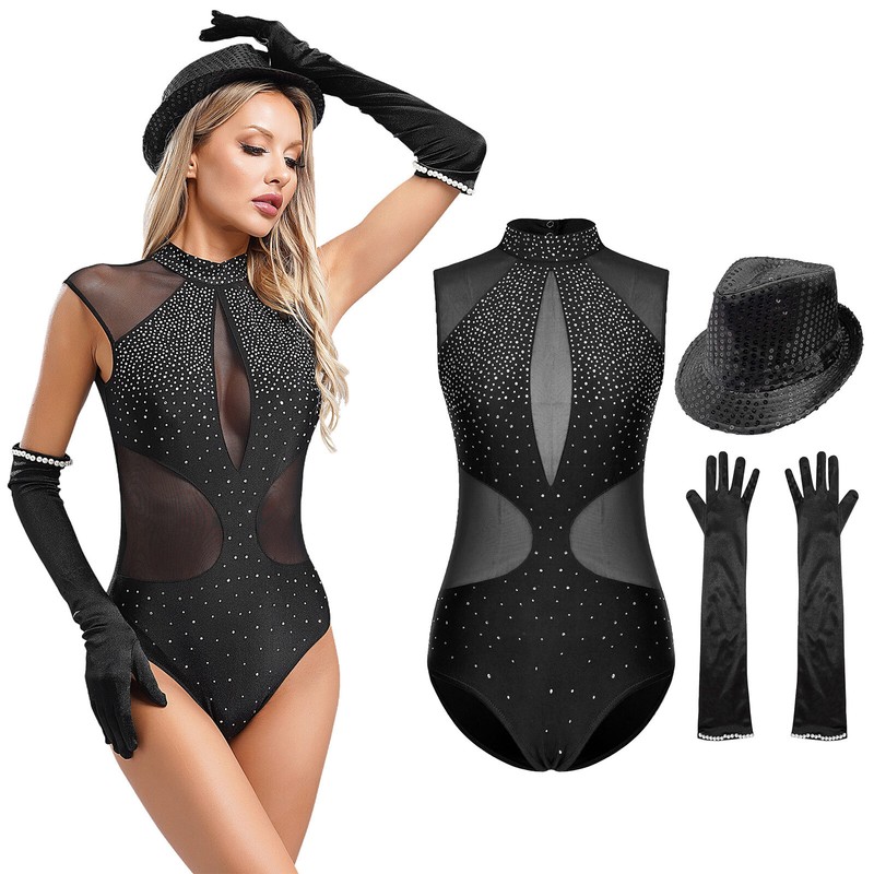 The sleeveless leotard ensures overall movement and flexibility. pair with faux pearls trim satin gloves and sequins hat