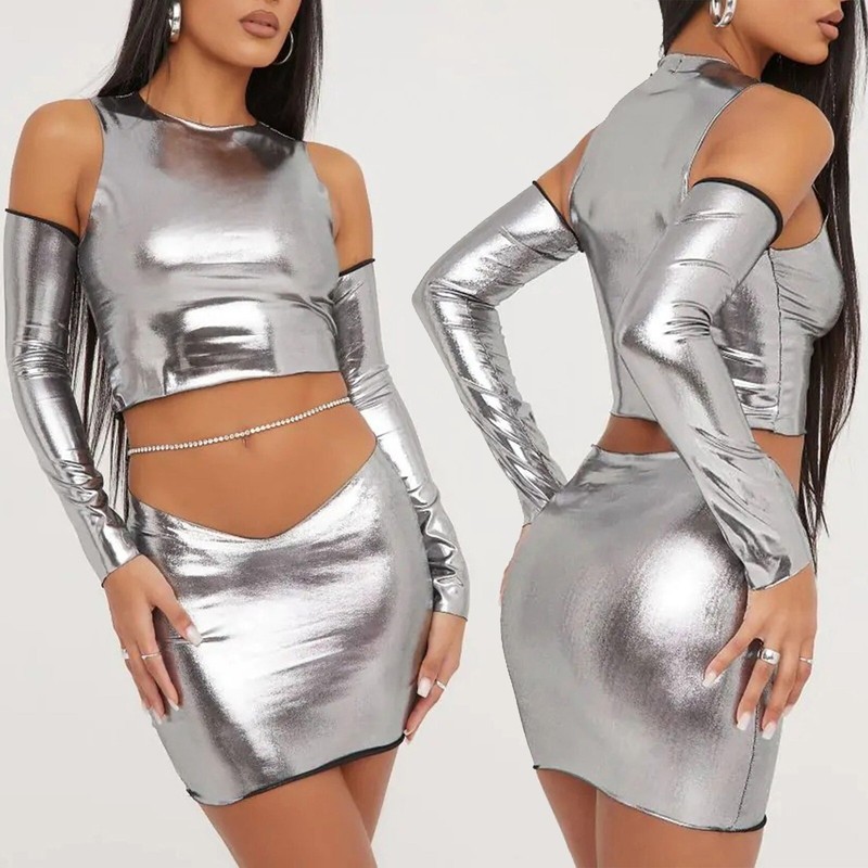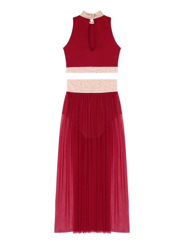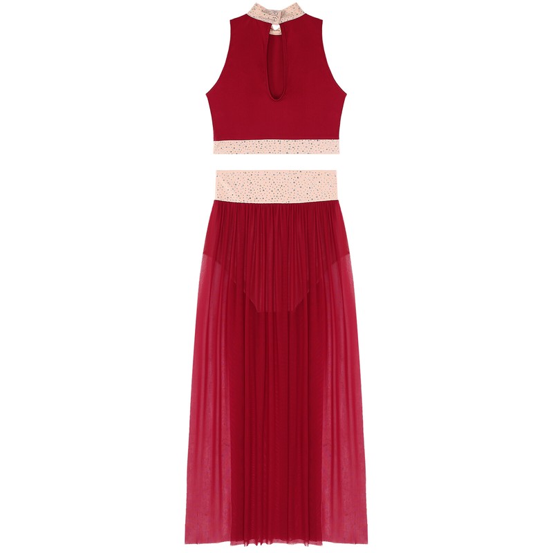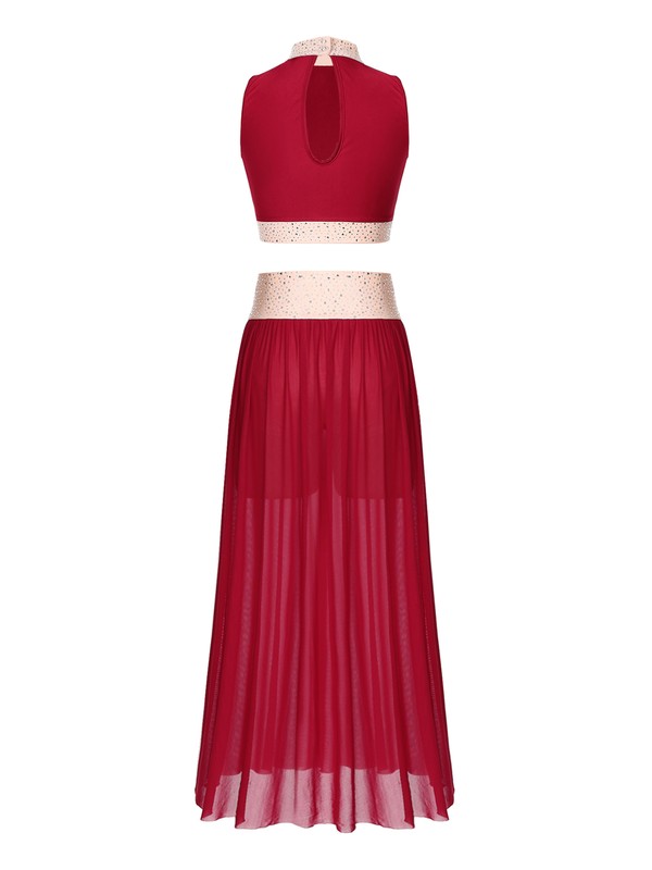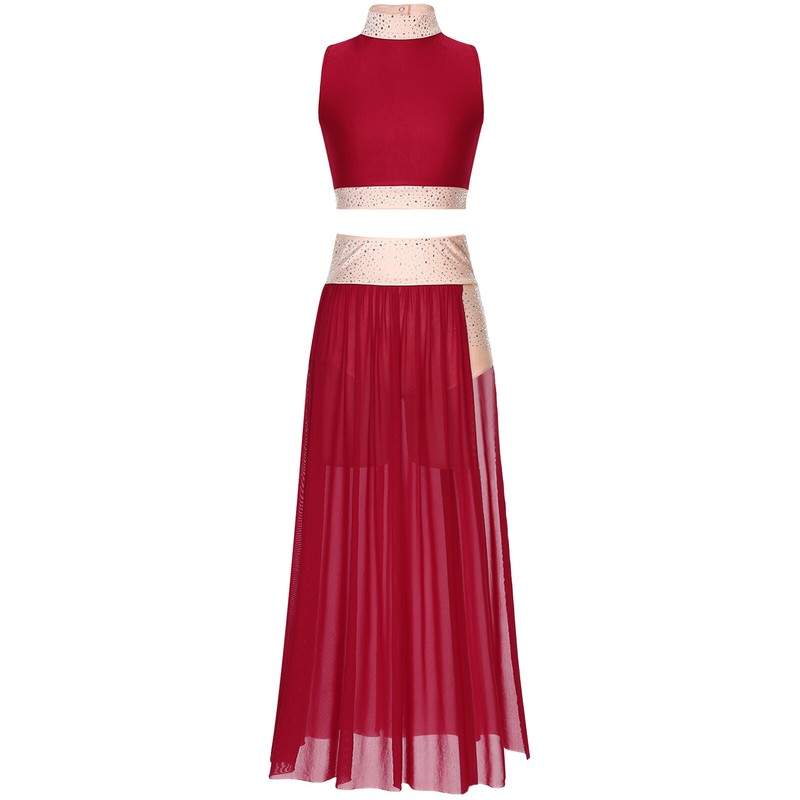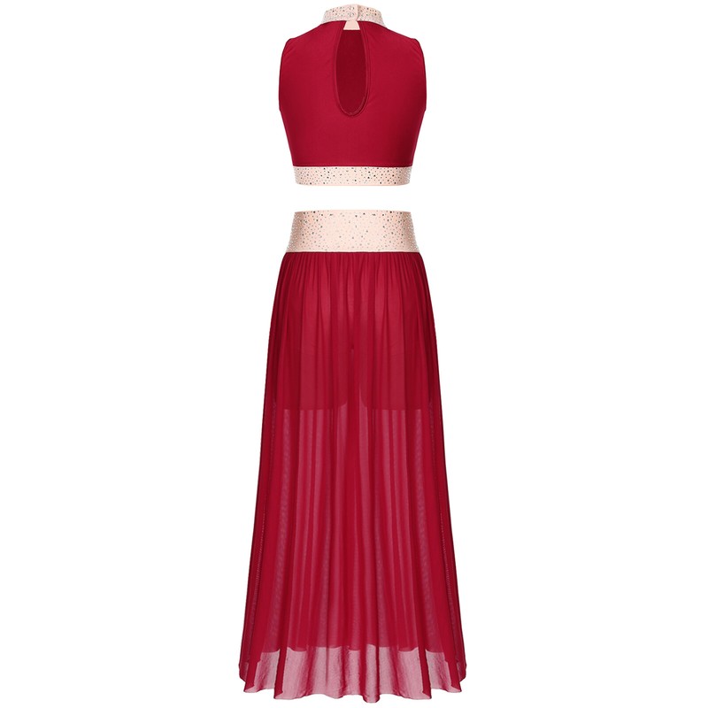 This crop top and skirt dance set is adorned with sparkling rhinestones to make you stunning and charming in the show.
