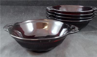 Five (5) Handled Fruit/Dessert Bowls by Anchor Hocking in the Coronation Royal Ruby pattern