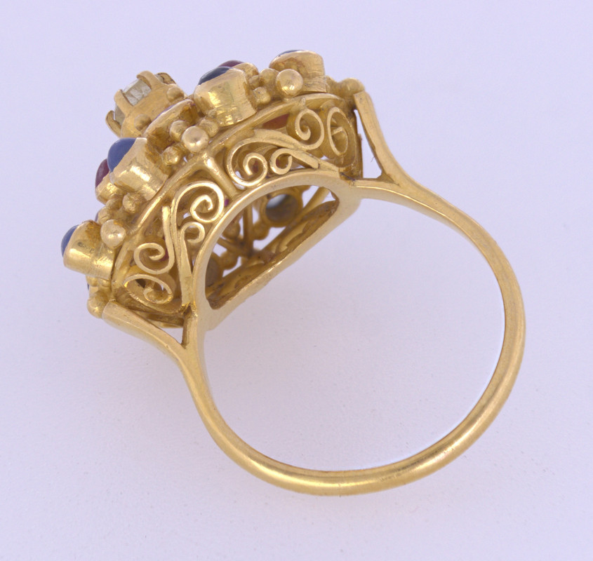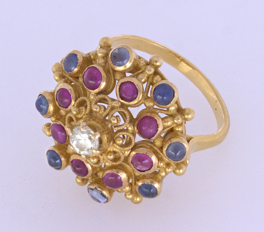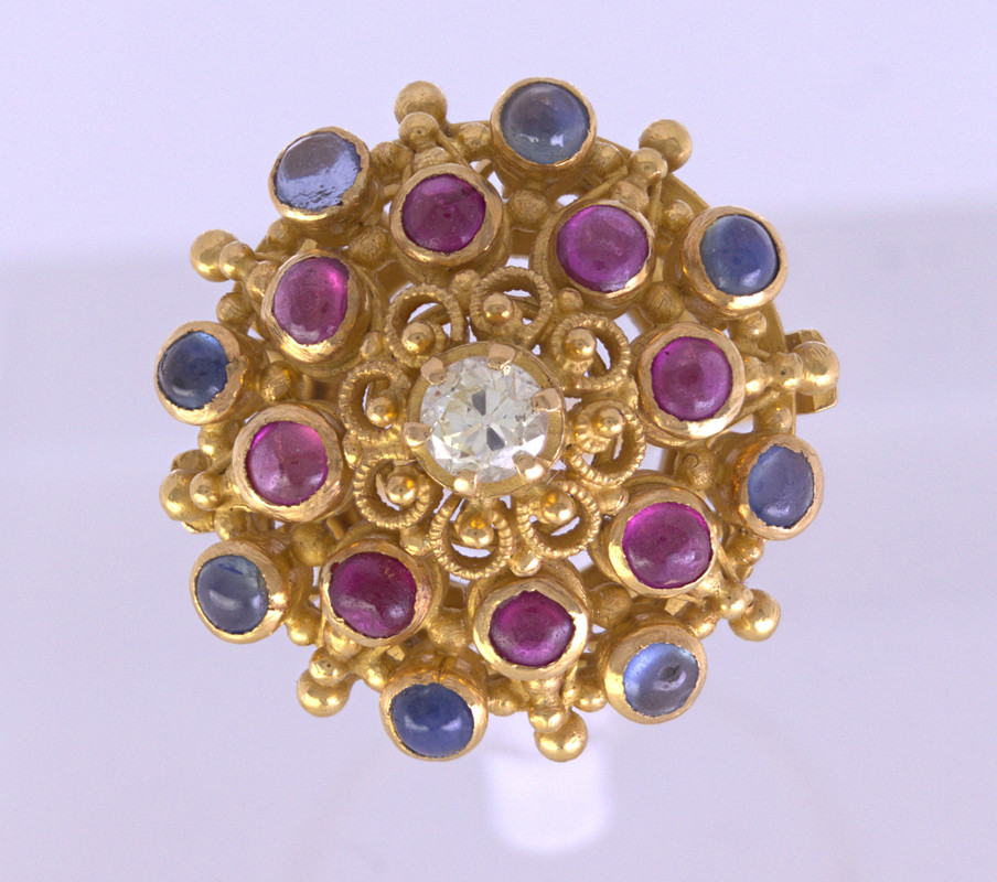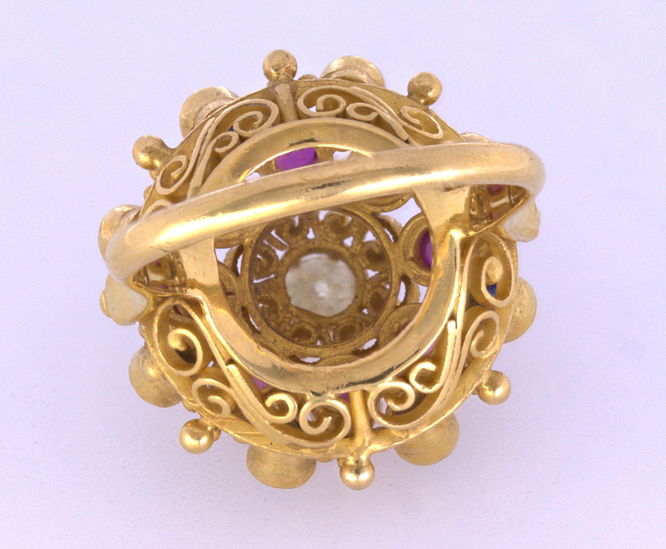 Centering (1) old European-cut diamond, weighingapproximately 0.15 ct., surrounded by (2) full-cut diamonds, weighing a total of approximately 0.60 ct.tw., set in a 21k (21.1k XRF-DXL) “princess” style mounting, measuring approximately 19.8 mm to 1.9 mm, Size 5.5, Gross weight 7.34 grams.