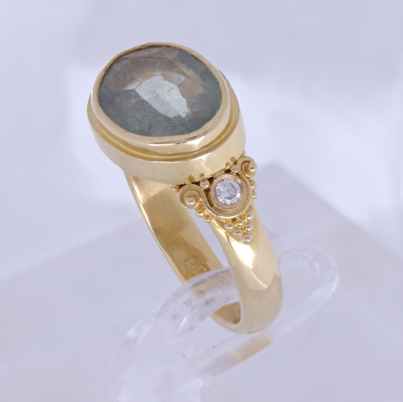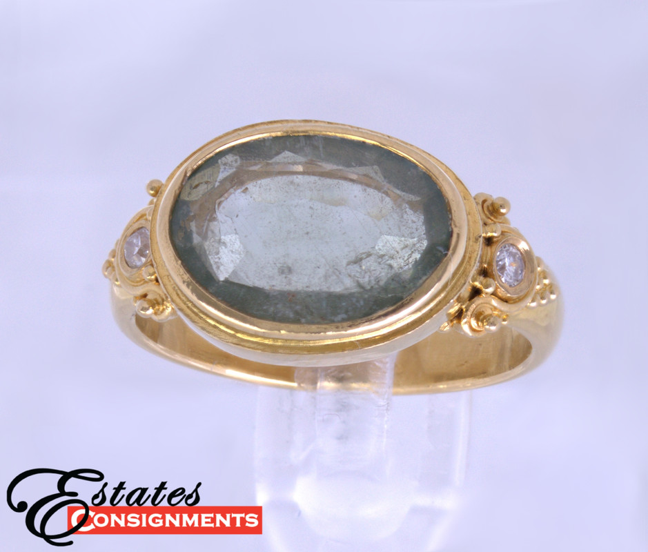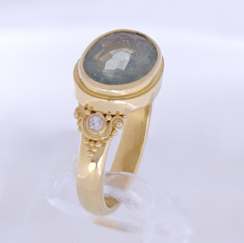 Featuring (1) oval-cut chrysoberyl, weighing approximately 2.00 cts., flanked by (2) full-cut diamonds, weighing a total of approximately 0.05 ct.,tw., bezel set in a 21k (21.2K XRF-DXL) yellow gold granulated shoulder mounting, measuring approximately 10 mm to 3 mm, marked 22K Gross weight 6.40 grams