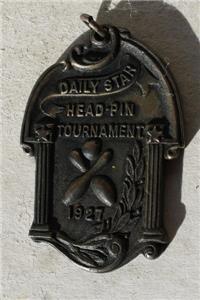 Here is a great vintage Bowling Sterling Silver Daily Star England UK Head Pin Tournament 1927 Medal Crossed Pins Bowling Ball. It is Awesome. Marked on back-SEE PHOTOS. It measures about 1 1/2 inches tall by about 1 inches long. Grab this great vintage Bowling Collectible while you still can it will not last long.