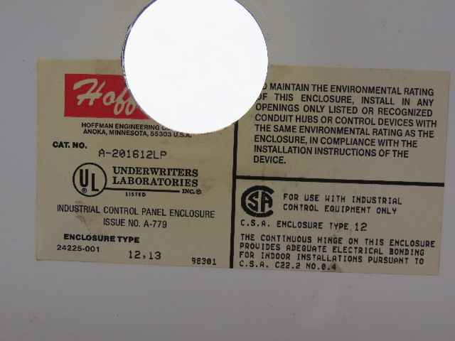Hoffmann A-201612LP 20x16x12" Steel Electrical Enclosure Wall Mount W/Back Plate Hoffmann