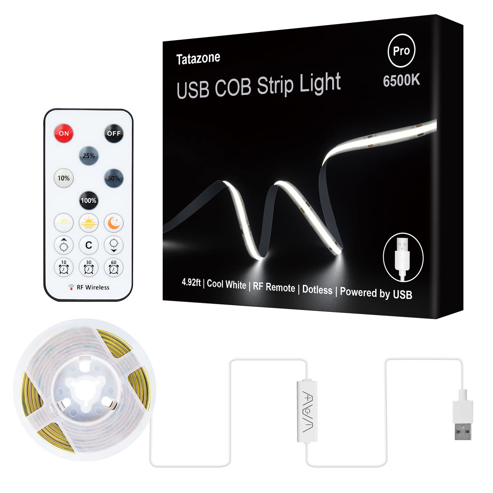 Tatazone 5V USB COB Led Strip Light with RF Remote, 4.92ft 6500K USB Powered COB Led Light Strip, Dimmable Indoor COB Led Tape Light for TV Backlight, Monitor, Showcase, Camping, Motorhome