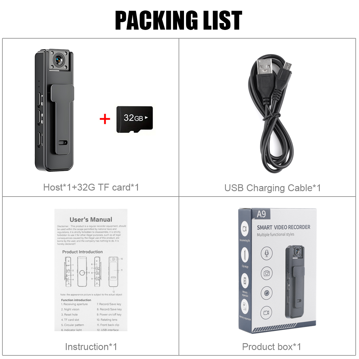 * Built-in high-capacity 500 mAh lithium battery, long battery life, 5 hours of video recording, 30 hours of recording; power outage auto-save, support charging while recording;