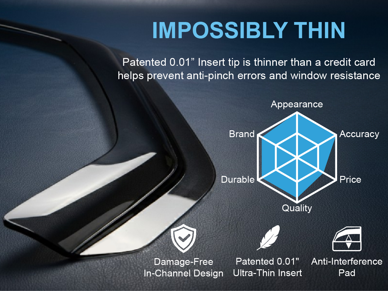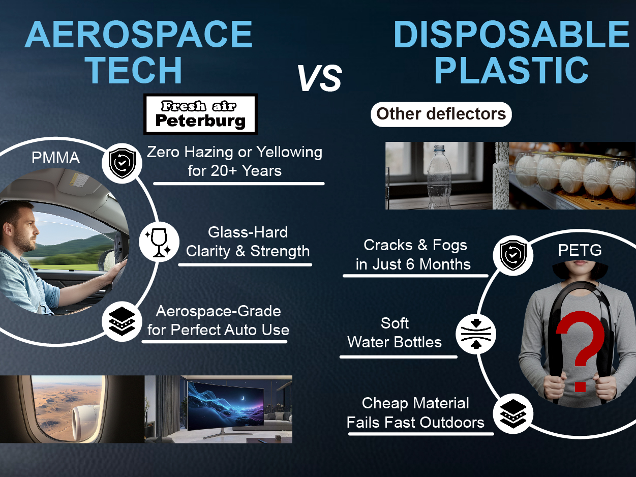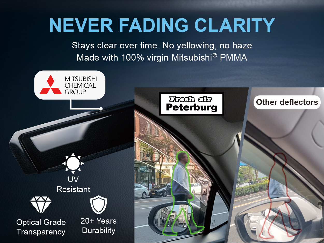 Our 100% PMMA material visors rain guards, offering exceptional durability and transparency for over 20 years to ensure safety, unlike other products using PC materials that haze over time, reducing visibility and safety.- Enhanced Driving Safety & Comfort