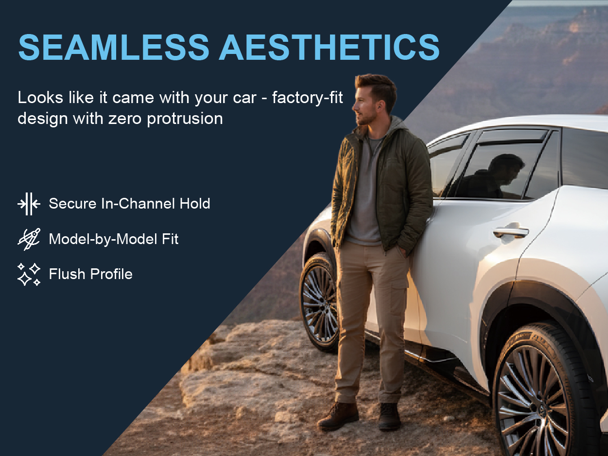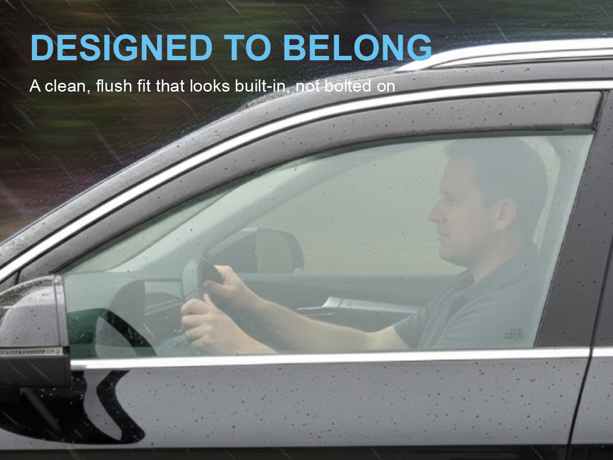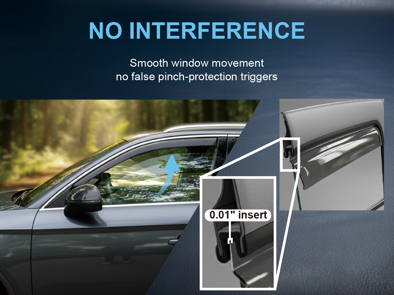 This window rain guard design helps reduce wind noise and rapidly defog windows, providing a comfortable driving experience even in adverse weather or driving condition. Drive confidently into automated car washes without worrying about the window visors falling off. These rain guards for car windows help adjust the room temperature and reduce odors, contributing to a more pleasant and comfortable in-car environment. Ideal for car lovers seeking a premium driving experience.- Anti-Pinch Design & High Precision
