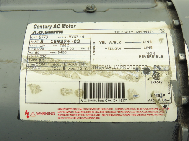 A.O Smith Century B770 Single Phase AC Motor 2Hp 3450 RPM 230V 1PH T56C