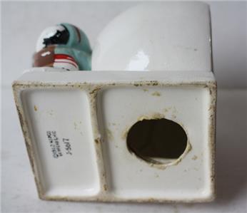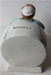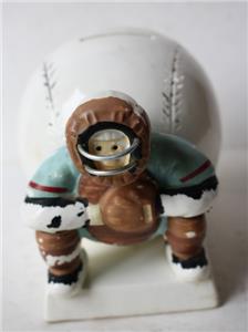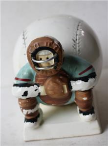 Here's a great vintage 1962 Napco Bedford Ohio ceramic hand painted Baseball Catcher with face mask Coin Bank Baseball as Bank. It does have paint loss and a couple hairline cracks. It measures about 4 1/2 inches tall and about 4 inches wide. Does have paint loss and cracks-SEE ALL PHOTOS!