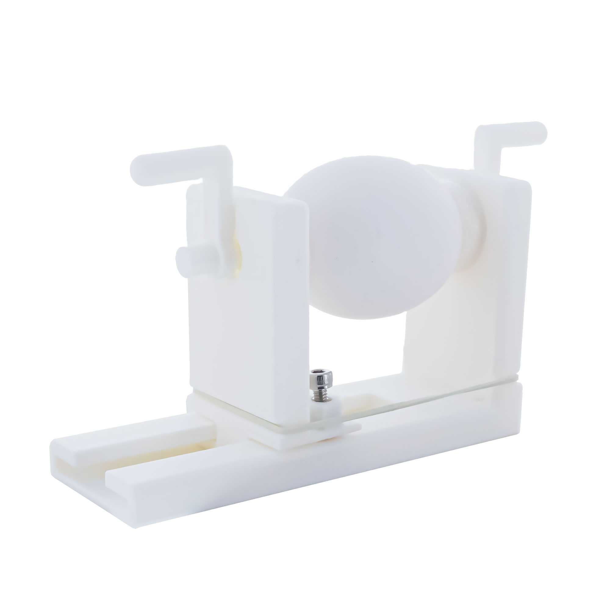 Decorating is easier and more precise with this handy lathe. It is designed to hold objects such as spheres, eggs, Christmas ornaments, etc., securely but gently in place, while turning the object for easy decorating. Foam pads provide just enough pressure to hold the object in place. The distance between the jaws is adjustable by means of a thumbscrew in the base. Either handle can be used to rotate your object making the decorating task easy for either right or left-hand use.