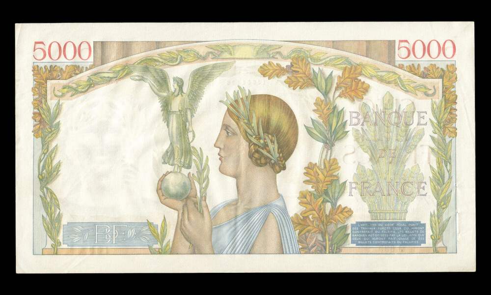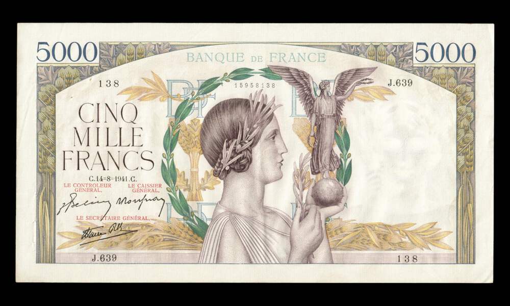 FRANCE Banque de France 5000 Francs Victoire, August 14, 1941 F.46.25, P.97c Numbering: J.639 138 Condition: VF+ / VF+ - Discreet pin rust. Crunchy. Delivery Service: Recommended Letter. Careful shipping. The ticket you are purchasing is the one pictured.