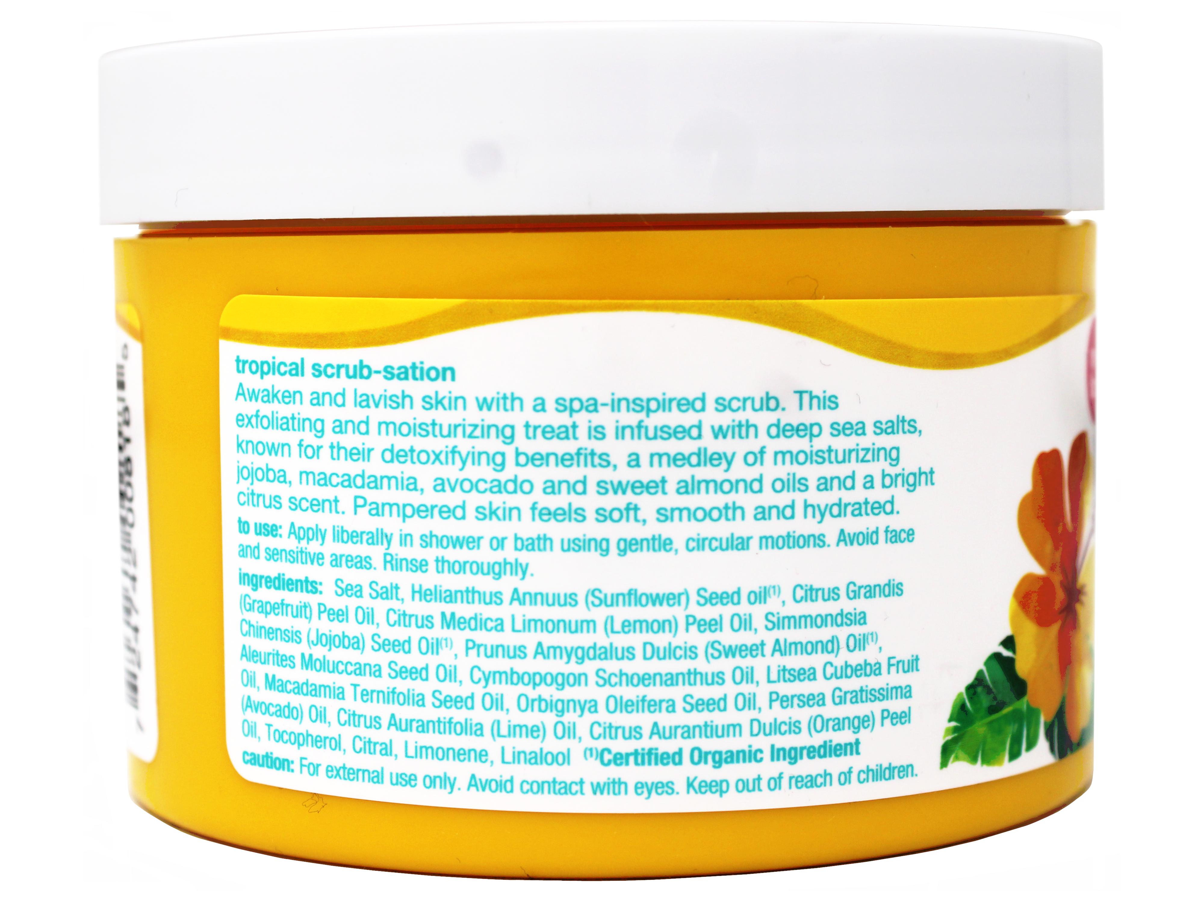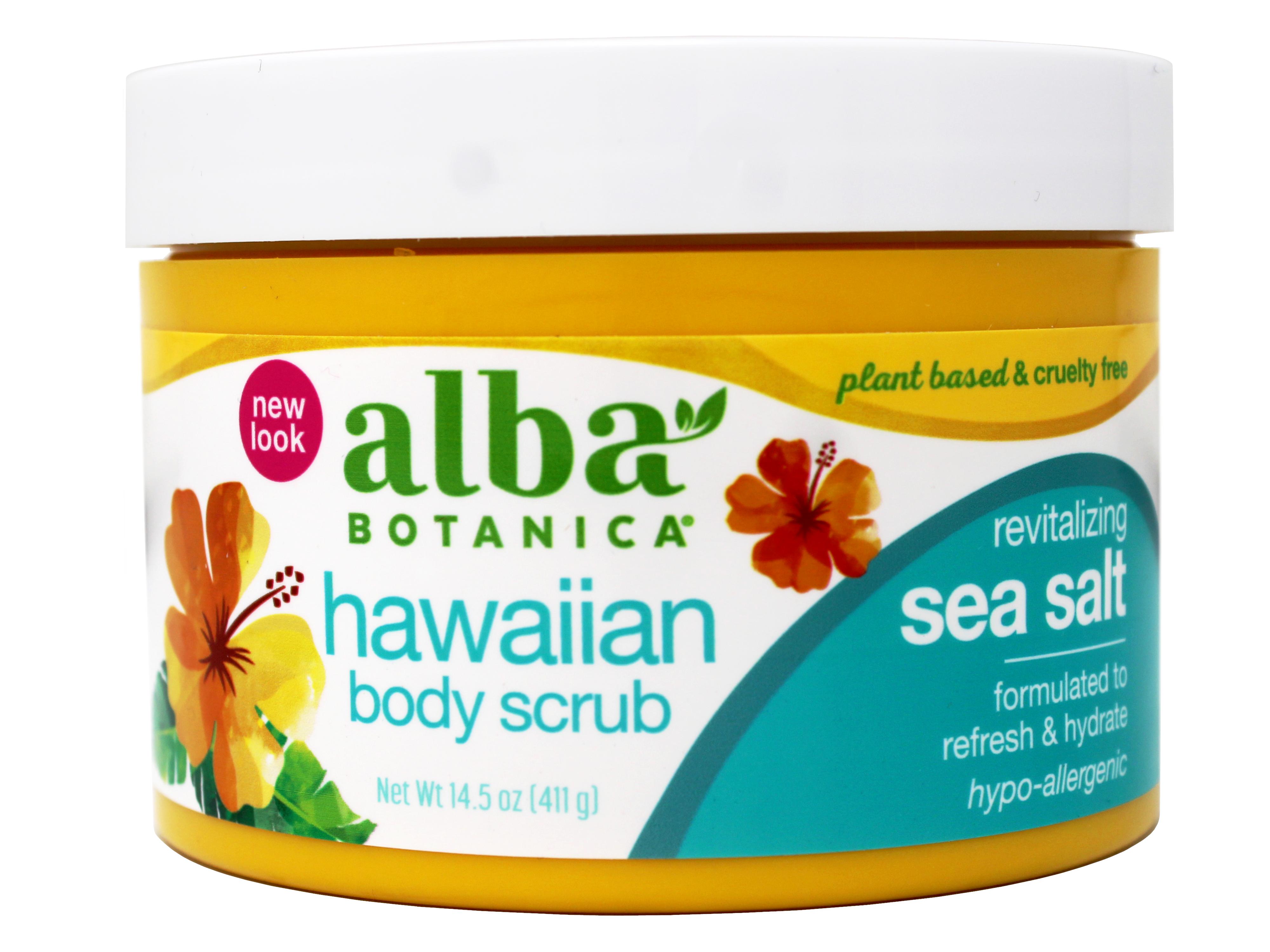 Alba Botanica Revitalizing Sea Salt Hawaiian Body Scrub Treat yourself to an at-home spa day with Alba Botanica Revitalizing Sea Salt Hawaiian Body Scrub. Pacific sea salts deeply detoxify and exfoliate dry skin, while nourishing jojoba, macadamia, avocado and sweet almond oils provide hydration, leaving your skin pampered and nourished with a light tropical scent. Our 100% vegetarian formula is hypo-allergenic and does not contain any parabens, phthalates or harsh sulfates. It is also not tested on animals. Includes one 14.5 oz. jar of Alba Botanica Revitalizing Sea Salt Hawaiian Body Scrub. At Alba Botanica, our product family constantly evolves alongside health, beauty, and ingredient knowledge and trends. We’re dedicated to making high quality, 100% vegetarian products that overflow with botanical ingredients. Do beautiful – that’s the motto that motivates our body loving products that nourish the skin, hair and, of course, the soul.One 14.5 oz container of Alba Botanica Hawaiian Body Scrub Revitalizing Sea Salt Pacific sea salts deeply detoxify and exfoliate dry skin Made with a plant-based blend of botanical ingredients like nourishing jojoba, macadamia, avocado, and sweet almond oils to provide hydration 100% vegetarian formula made without harsh ingredients like parabens, phthalates or synthetic fragrances Always cruelty-free, never tested on animals; recognized by the Leaping Bunny Program