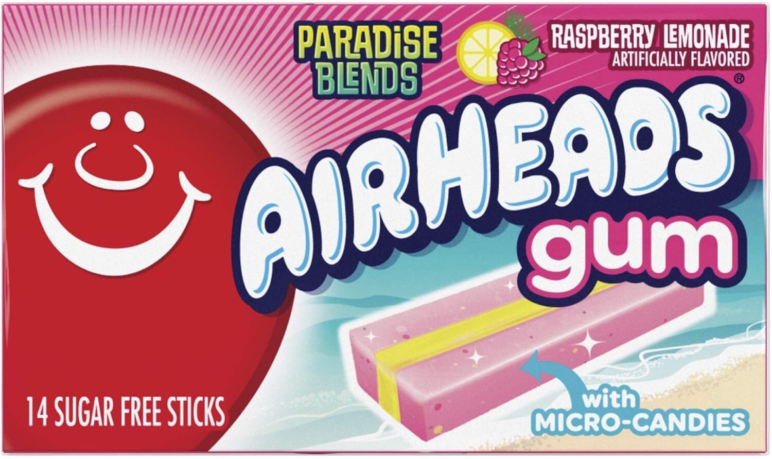 Airheads inspired sugar free gum. Made with micro candies for lasting flavour! Raspberry Lemonade flavoured gum.