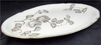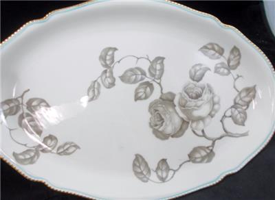 This elegant pattern was produced by Castleton in 1941 and discontinued in 1972. It features a design of taupe colored roses, a thin blue line with a pearl edge and gold trim.