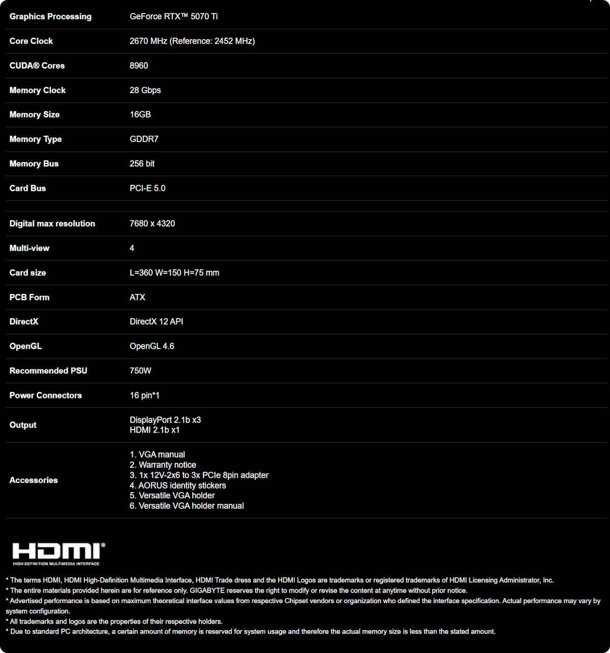 Gigabyte GeForce AORUS RTX 5070 Ti 16GB GDDR7 RGB LED Graphics Video Card