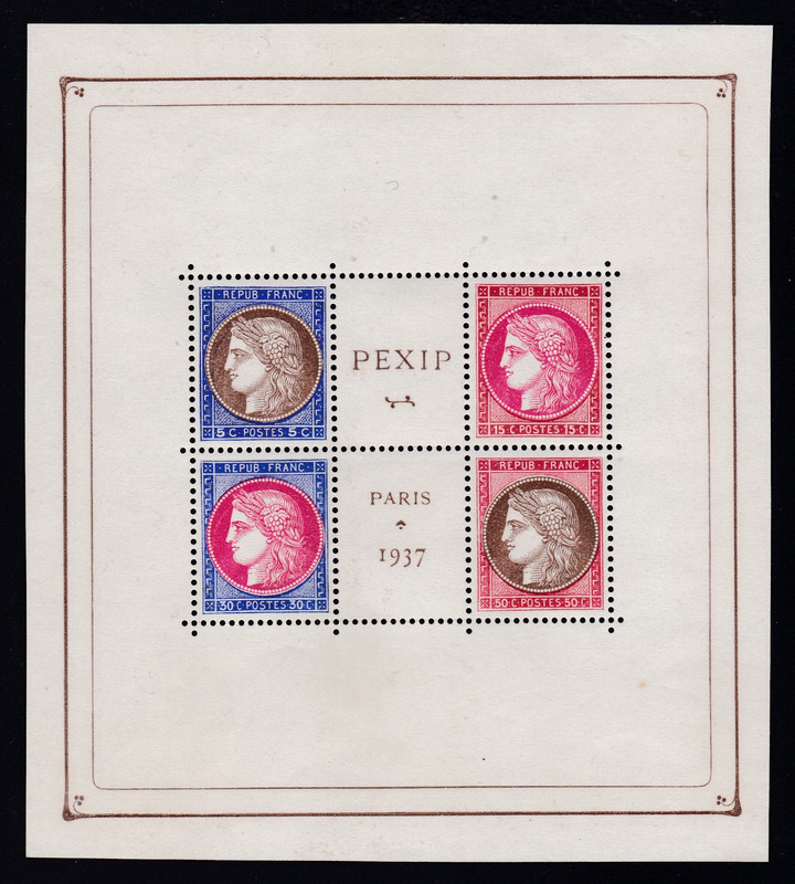 Yvert bloc number 3 with 2022 catalogue value € 800.-. The sheetlet has no hinge remnants but several tiny gum disturbances in the upper and lower sheet margins, hardly visible. The „heart“ of the bloc is very fine mint never hinged. This central quartet values € 450 in the same catalogue. No other faults.