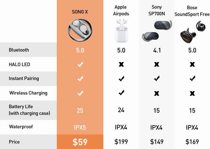 SONGX is a set of wireless earbuds that embody individuality and self-expression. With a sleek and stylish innovative design, different choice of colors, and added light effects, SONGX gives the sound a more tailored touch and feel. Using only the highest-grade components, a 6mm moving coil and a metal vibration membrane, the earbuds output high frequency clear and translucent sounds, thick bass, and all-around undistorted audio.