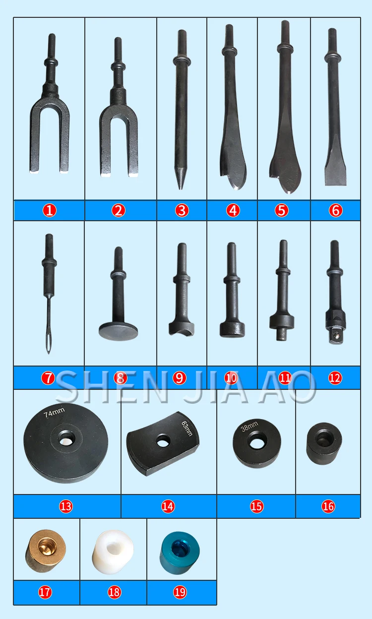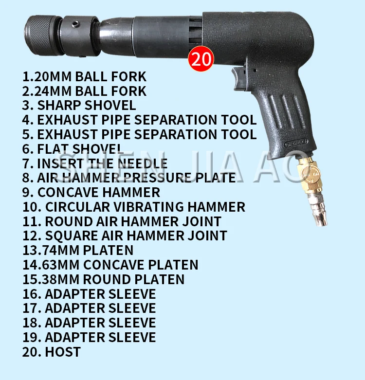Function: Air hammer set is suitable for car maintenance, vibration disassembly of various car screws, loose half shaft/brake disc disassembly ball head/ball cage/brake disc, adhesive removal, loosening aluminum parts, sheet metal separation, two Platen adapters are used to press out small size bearings/sleeves.