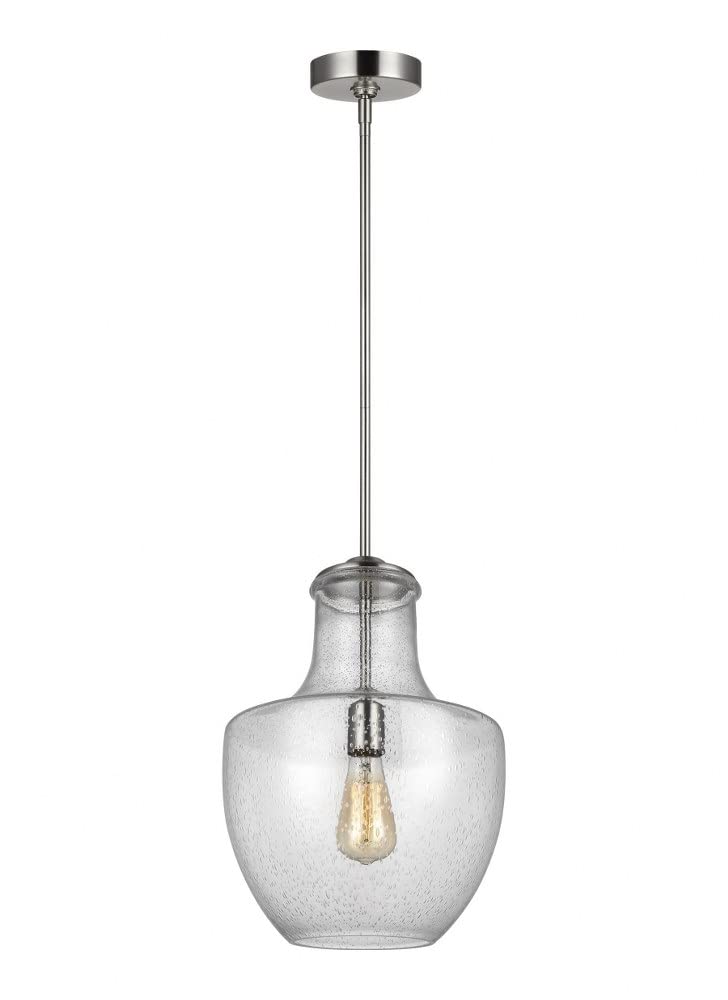 The Feiss Baylor one light indoor pendant in satin nickel provides abundant light to your home, while adding style and interest. Taking inspiration from the generous vessel and slender neck of a vintage glass jug, the pendants of the Baylor Collection by Feiss make their presence known in an understated way, with an eye-catching yet simple silhouette and a classic Clear Seeded glass shade. Baylor pendants are available in two hardware finish options, either Satin Nickel or Oil Rubbed Bronze. Both fixtures have a Clear Seeded glass shade. Exposed lamping (sold separately) gives a slightly rustic, industrial feel. Baylor pendants measure 12" at their widest point, and are 17" high.