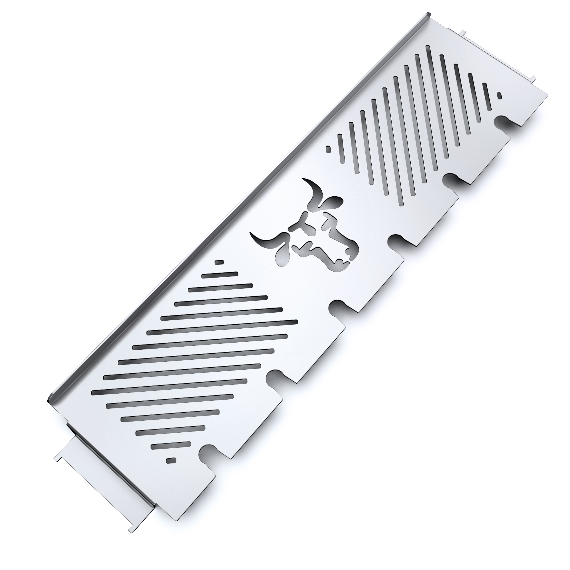 Die perfekte Ergänzung für Ihren Grill. Unser passgenau gefertigter Warmhalterost im einzigartigen Bullendesign überzeugt als Warmhalterost und verschafft Ihnen zusätzlichen Platz auf dem Grill. Die ausgelaserten Halterungen ermöglichen ein problemloses Aufhängen von mehreren Hähnchenkeulen.