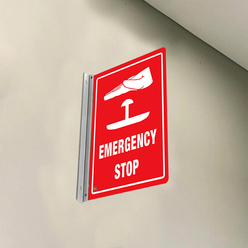 Clearly identify critical control points with our Emergency Stop Double Sided Off Wall Sign (OFF14). This sign is essential for marking emergency stop buttons or switches in factories, warehouses, workshops, laboratories, and industrial facilities where immediate shutdown may be required to prevent injury or equipment damage. It ensures that staff and emergency responders can quickly locate and activate stop mechanisms during hazardous situations, supporting rapid response and workplace safety. The bold, easy-to-read text and universally recognised stop symbol enhance visibility, promote fast recognition, and encourage prompt, correct action under pressure. Constructed from durable, weather-resistant materials, this sign remains clear and legible in both indoor and outdoor environments. The premium aluminium double-sided bracket provides long-lasting strength, corrosion resistance, and secure wall mounting. Its outward projection ensures superior visibility from multiple directions, guaranteeing that emergency stop controls are easily identifiable, accessible, and ready for operation whenever urgent action is required, supporting overall compliance with workplace safety standards.