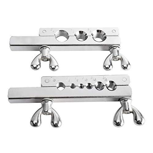 Form precise and accurate flares and swages with the YaeTek Flaring Swaging Kit. This steel flaring tool set includes an adjustable bar that smoothly glides along the yoke to adjust the flare to your desired size. Simply lock the size in by turning the wing nuts tightly. The flaring tool adapters range from the following sizes: 1/8", 3/16", 1/4", 5/16", 3/8", 7/16", 1/2", 5/8", 3/4". The flaring tools include 7 swage fittings and include the following outer diameter (OD) tube sizes: 3/16", 1/4", 5/16", 3/8", 1/2", 5/8", 3/4". The swivel is constructed from chrome-plated alloy steel, while the yoke is forged from heat-treated steel. This kit comes packed inside a carrying case for your convenience. Not intended as a double, bubble, or inverted flaring tool.