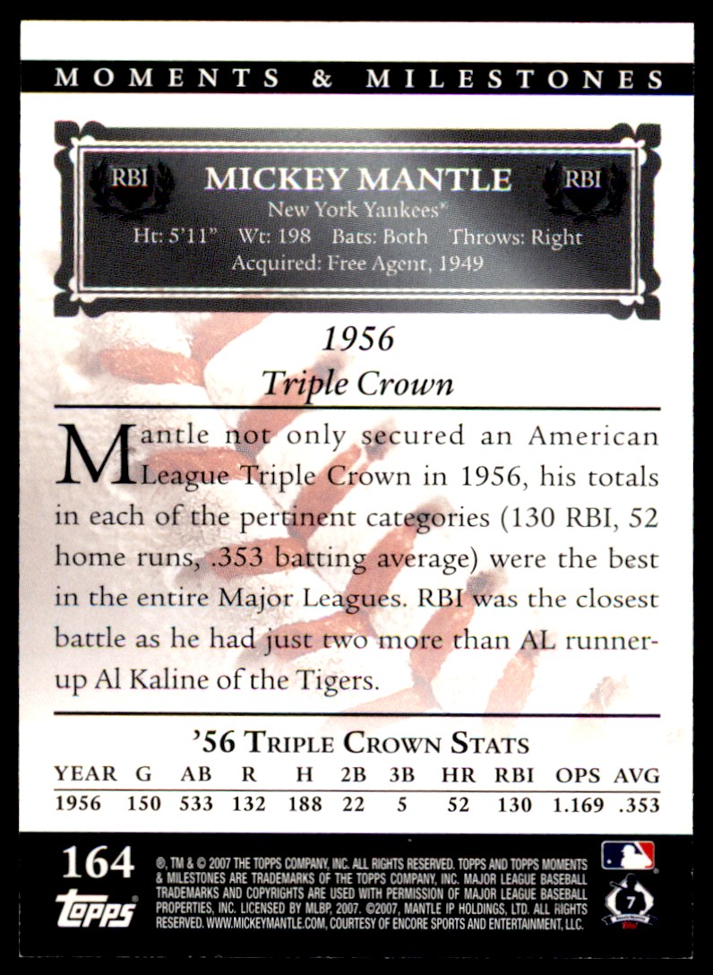 | 2007 Topps Moments & Milestones Mickey Mantle 094/150 New York Yankees #164 | ||||||||||||||||||