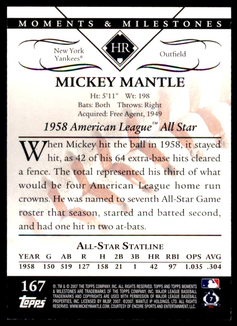| 2007 Topps Moments & Milestones Mickey Mantle 019/150 New York Yankees #167 | ||||||||||||||||||