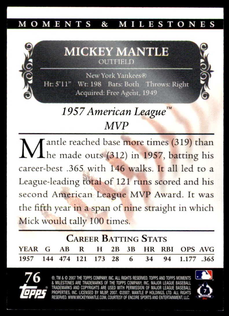 | 2007 Topps Moments & Milestones Mickey Mantle 082/150 New York Yankees #76 | ||||||||||||||||||