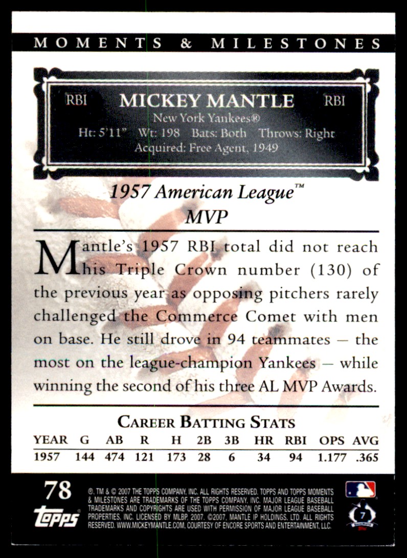 | 2007 Topps Moments & Milestones Mickey Mantle 128/150 New York Yankees #78 | ||||||||||||||||||