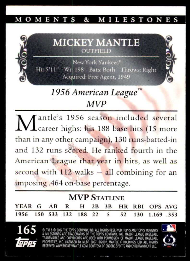 | 2007 Topps Moments & Milestones Mickey Mantle 134/150 New York Yankees #165 | ||||||||||||||||||