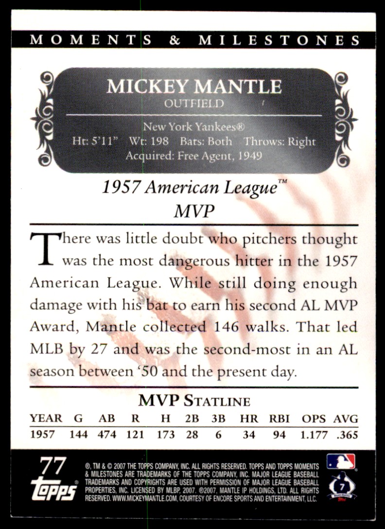 | 2007 Topps Moments & Milestones Mickey Mantle 126/150 New York Yankees #77 | ||||||||||||||||||