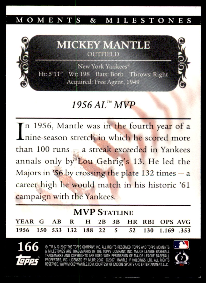 | 2007 Topps Moments & Milestones Mickey Mantle 076/150 New York Yankees #166 | ||||||||||||||||||