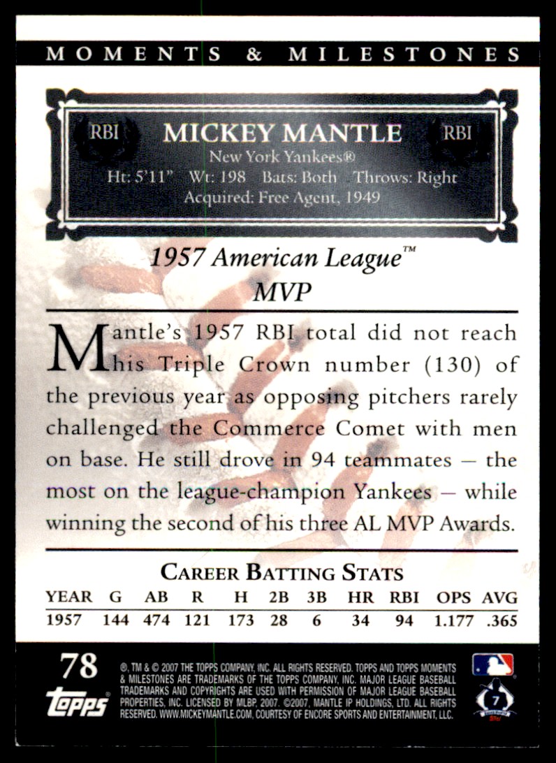 | 2007 Topps Moments & Milestones Mickey Mantle 040/150 New York Yankees #78 | ||||||||||||||||||