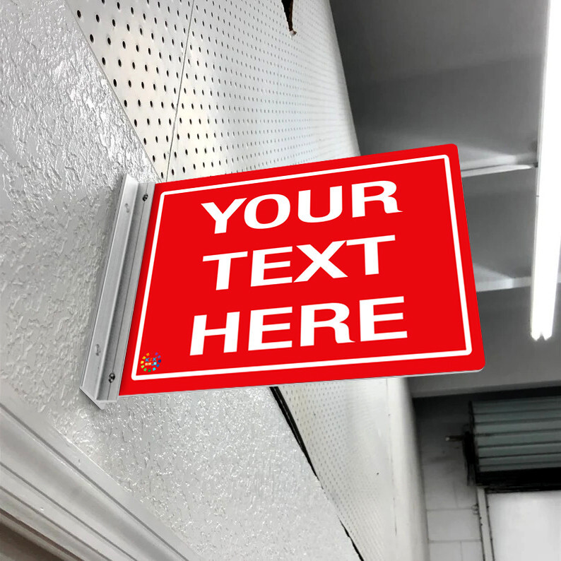 Improve visibility and safety communication with our Double Sided Off Wall Custom Sign with Mount Wall Bracket in Sizes (OFFCUSTOM03). This sign is designed for displaying personalised messages, instructions, or warnings in offices, schools, hospitals, shopping centres, industrial facilities, and other busy environments. It ensures that staff, visitors, or emergency personnel can quickly locate and understand important information during critical situations. Featuring bold, easy-to-read text and fully customisable design options, this sign allows precise messaging tailored to specific needs. Made from durable, weather-resistant materials, it remains clear and legible in both indoor and outdoor conditions. The premium aluminium double-sided bracket provides strength, corrosion resistance, and secure wall mounting. Its outward projection offers superior visibility from multiple directions, guaranteeing that the custom message is easily seen, understood, and acted upon whenever necessary.DURABLE OUTDOOR CONSTRUCTION: Crafted from high-quality, weather-resistant metal designed to withstand long-term exposure. The strong aluminium bracket secures the display firmly, preventing movement or detachment while projecting Off Wall to provide clear visibility in corridors, hallways, and building exteriorsFLEXIBLE SIZE OPTIONS: Supplied in 250mm x 180mm and 300mm x 225mm sizes to suit a variety of locations. The smaller version is perfect for restricted or compact spaces, while the larger size offers bold, prominent identification for busy areas requiring clear visibility from a distance in offices, factories, and public areasRESILIENT PRINT TECHNOLOGY: Printed using advanced eco-solvent or latex inks engineered to resist fading, abrasion, and environmental damage. Text and symbols remain crisp and clear over time, preserving a professional presentation and compliance in indoor and outdoor settings exposed to sunlight, rain, and humidityRELIABLE AND EASY MOUNTING: Equipped with a durable aluminium bracket and matching screws for secure wall attachment. The anodised aluminium surface enhances corrosion resistance and structural integrity, keeping the display firmly fixed in exposed, industrial, or high-moisture environmentsVISIBILITY AND REFLECTIVITY CHOICES: Available in standard finish for everyday readability, Class 2 reflective for high contrast under low-light conditions or vehicle headlights, and Luminous/Glow in Dark option for outstanding visibility at night or during power outages, supporting safety and effective hazard communication
