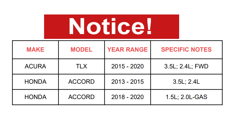 | HONDA | ACCORD | 2013 - 2015 | 3.5L; 2.4L |