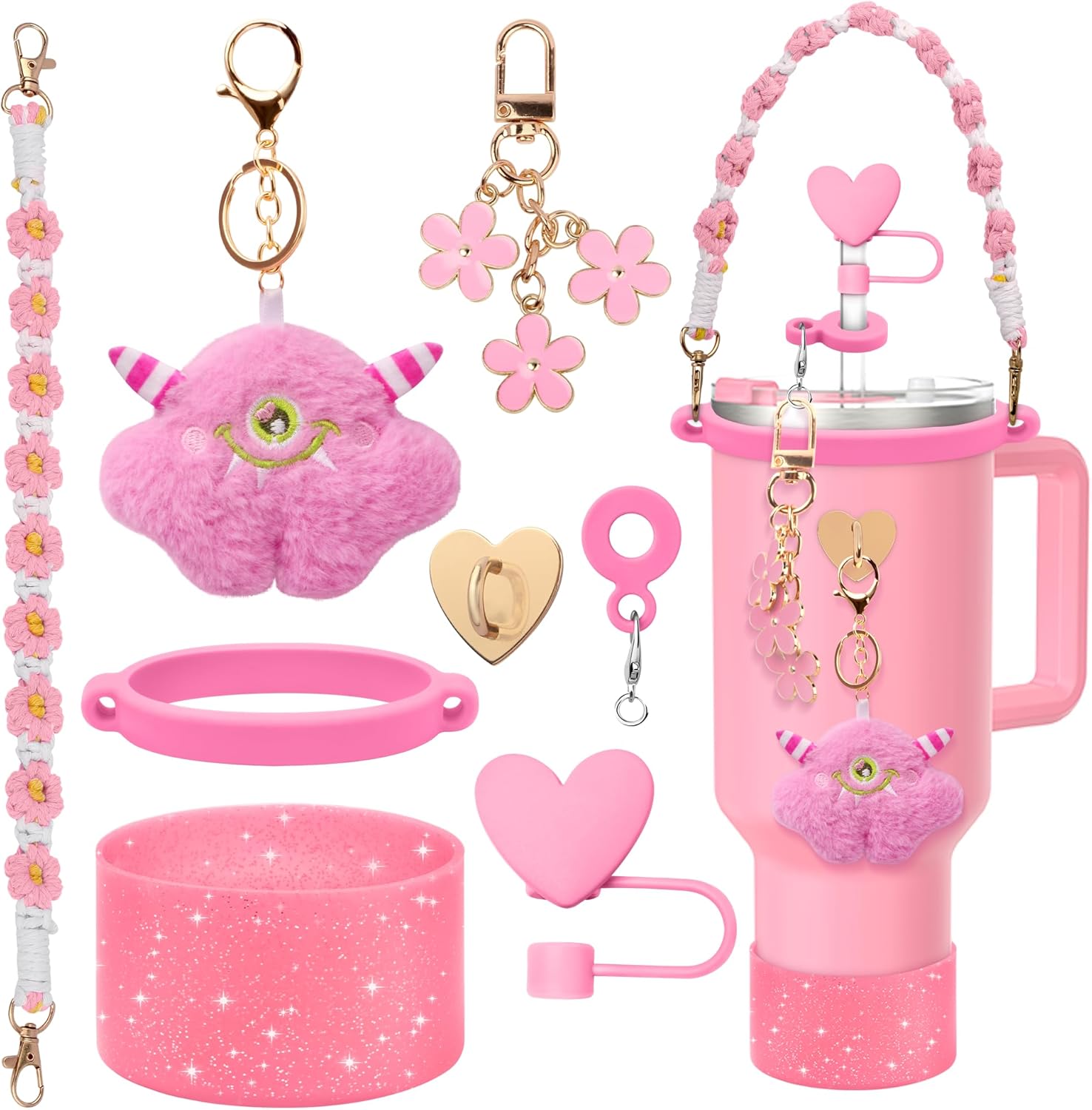 8PCS Cup Accessories Set for Stanley Cup 30oz 40oz, Including Water Bottle Strap, Silicone Heart Straw Topper Cap and Glitter Boot, Cute Elf and Charms for Stanley Tumbler Decorations