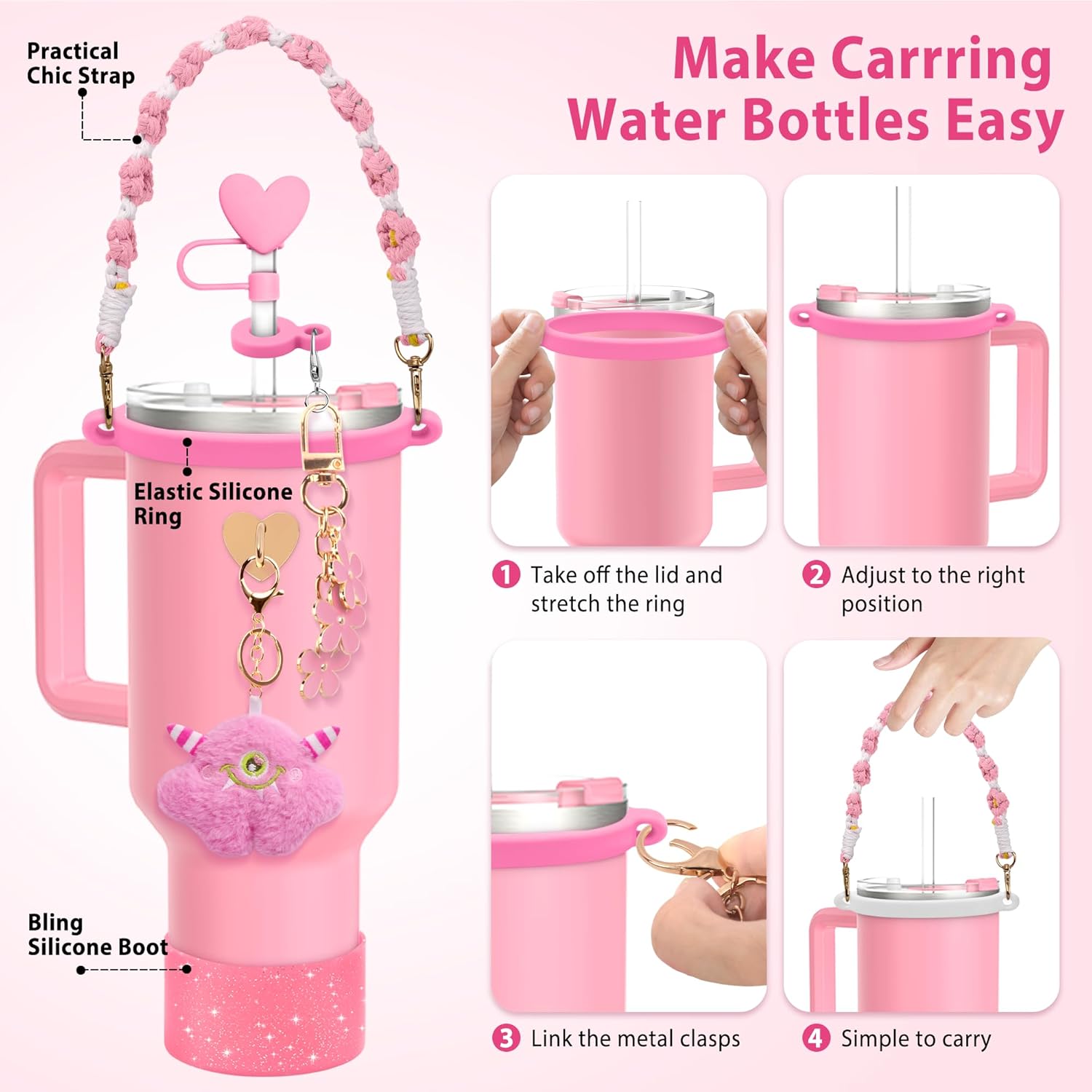 1.BPTAKOO stylish Cup Accessories Set makes your water bottle look much more fantastic and attractive with cute charms parts like cute Elf, glitter Boot, and flower key chain or cute flower strap.