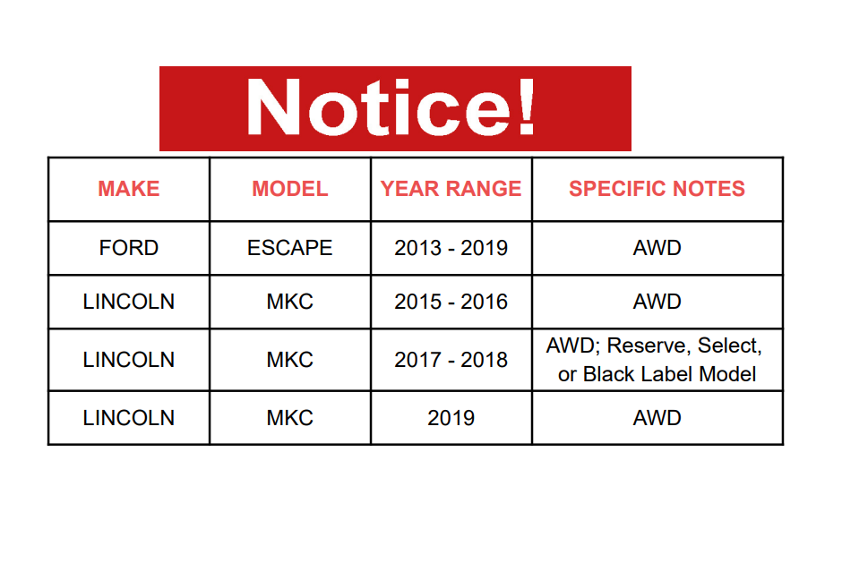 MAKE MODEL YEAR RANGE SPECIFIC DETAILS FORD ESCAPE 2013 - 2019 AWD LINCOLN MKC 2015 - 2016 AWD LINCOLN MKC 2017 - 2018 AWD; Reserve, Select, or Black Label Model LINCOLN MKC 2019 AWD