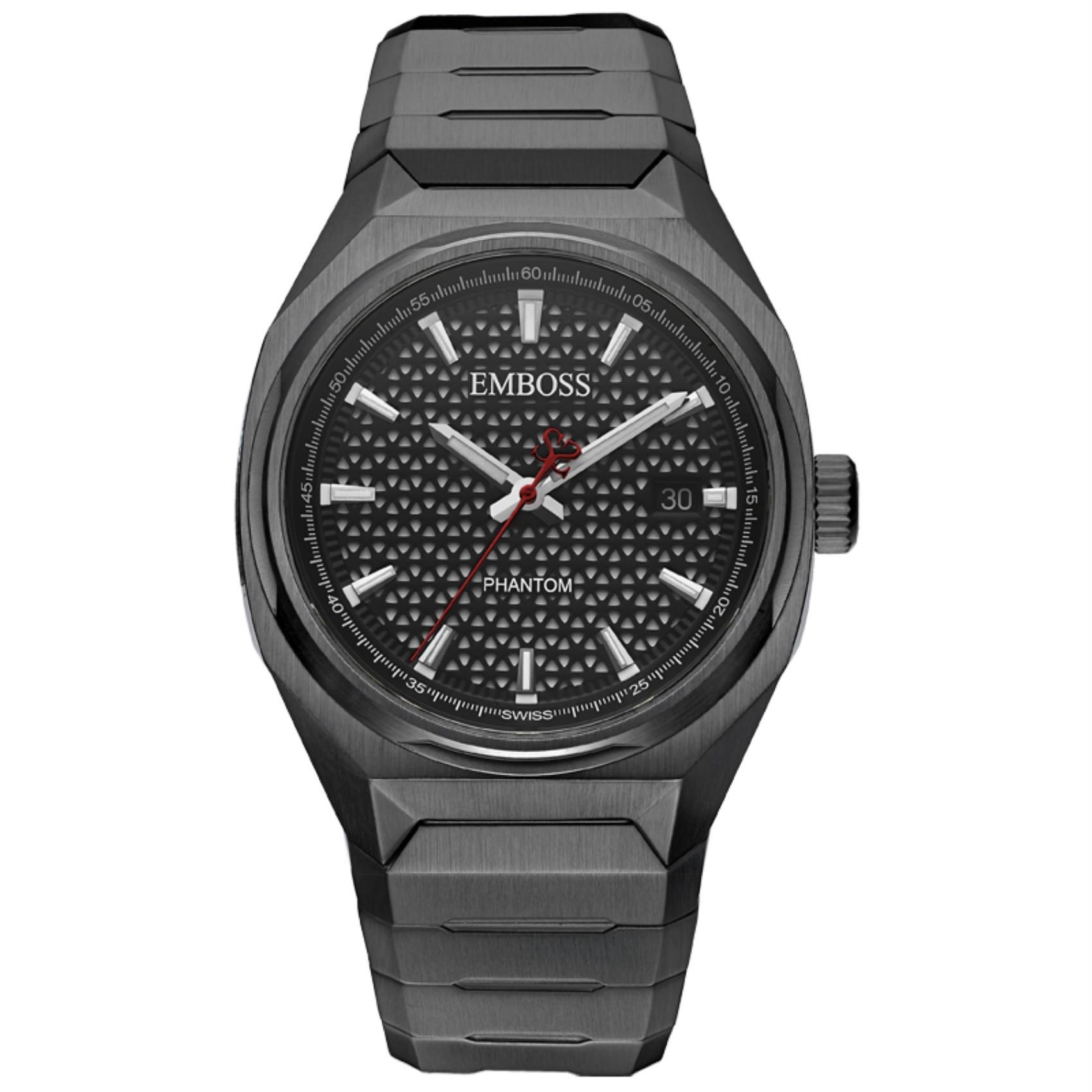 The EMBOSS Phantom Swiss Watch is a premium timepiece featuring a SWISS MADE RONDA 515 analog movement, ensuring high accuracy and reliability. The case and bracelet are crafted from durable 316L blackened stainless steel, providing strength and a sophisticated modern look. The dial is constructed with three layers, including Super-Luminova C1, a precision-cut steel mesh layer, and a sporty outer ring. A scratch-resistant sapphire crystal keeps the watch pristine, and with 100M water resistance, it is suitable for all-weather use.