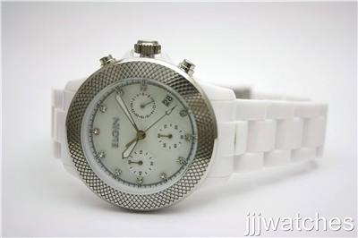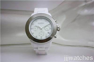 Dial color: White mother of pearl dial, silver luminous hands, crystals hour markers, minute and second indicator on outer dial
