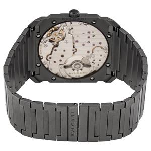 Grey titanium case with a grey titanium bracelet. Fixed grey titanium bezel. Grey dial with gold-tone hands and index hour markers. Arabic numeral at the 6 and 12 o'clock positions. Dial Type: Analog. Small seconds sub-dial. Bvlgari calibre BVL 138 utomatic movement, containing 36 Jewels, bitting at 21600 vph, and has a power reserve of approximately 60 hours. Scratch resistant sapphire crystal. Pull / push crown. Transparent case back. Octagon case shape. Case size: 40 mm. Case thickness: 5.15 mm. Fold over clasp. Water resistant at 30 meters / 100 feet. Functions: hour, minute. Octo Finissimo Series. Luxury watch style. Watch label: Swiss Made. Bvlgari Octo Finissimo Automatic Grey Dial Men's Watch 103137.