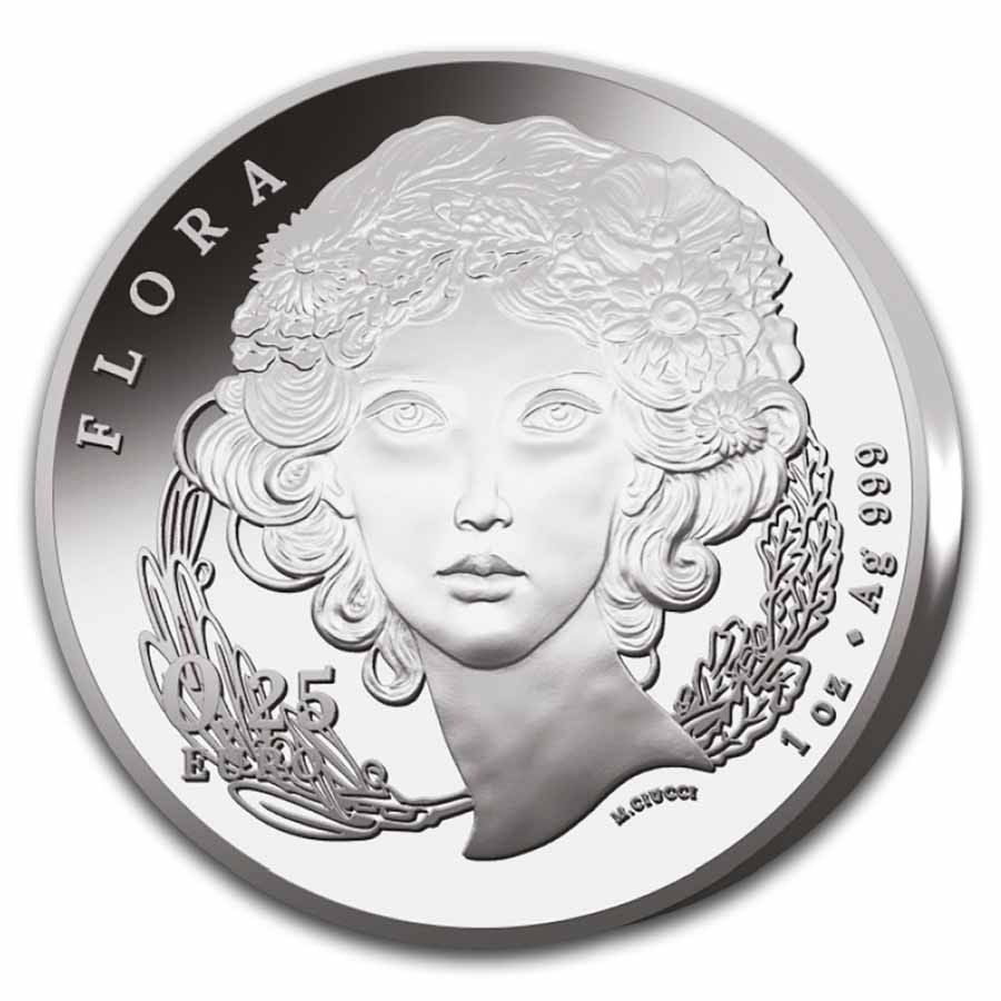 The Flora and Fauna series celebrates Italy's rich natural heritage by featuring native plants and animals. The 2025 edition honors the daisy, a flower emblematic of light and purity in Italian culture.On the obverse, the coin showcases a detailed depiction of wild daisies (Leucanthemum) at the center, with the botanical name inscribed on the left. The year of issue, 2025, and the mint mark R are positioned on the right, while the inscription REPUBBLICA ITALIANA arches above, encapsulating the design. The reverse features an artistic portrayal of a woman's face with flowing hair, crowned with a variety of flowers, embodying the personification of Italian flora. An olive branch and the denomination 0,25 EURO are elegantly placed on the left side, with an oak branch on the right. The inscriptions FLORA and 1 oz Ag 999 are thoughtfully positioned to enhance the overall aesthetic.